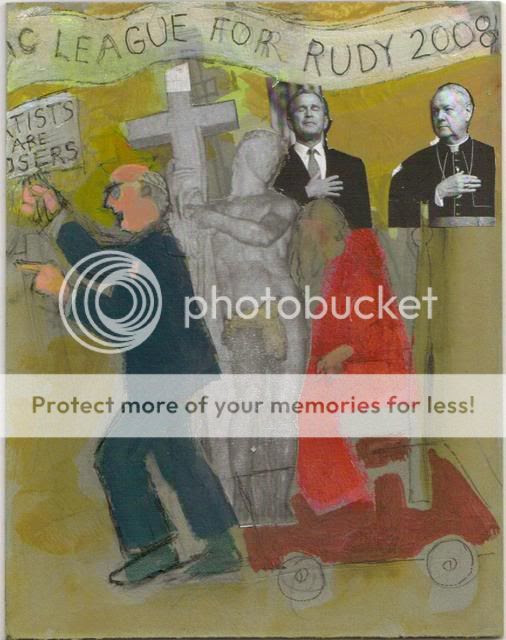 Catholic League President Bill Donohue with Jack in the Box head holding sign "Artists Are Losers," the Michelangelo sculpture Risen Christ later defaced by the Church by affixing a gold loincloth, the Monkey Pope painted by Titian in the 1500's in another wheeled chair, a banner overhead that reads "Catholic League for Rudy 2008"
